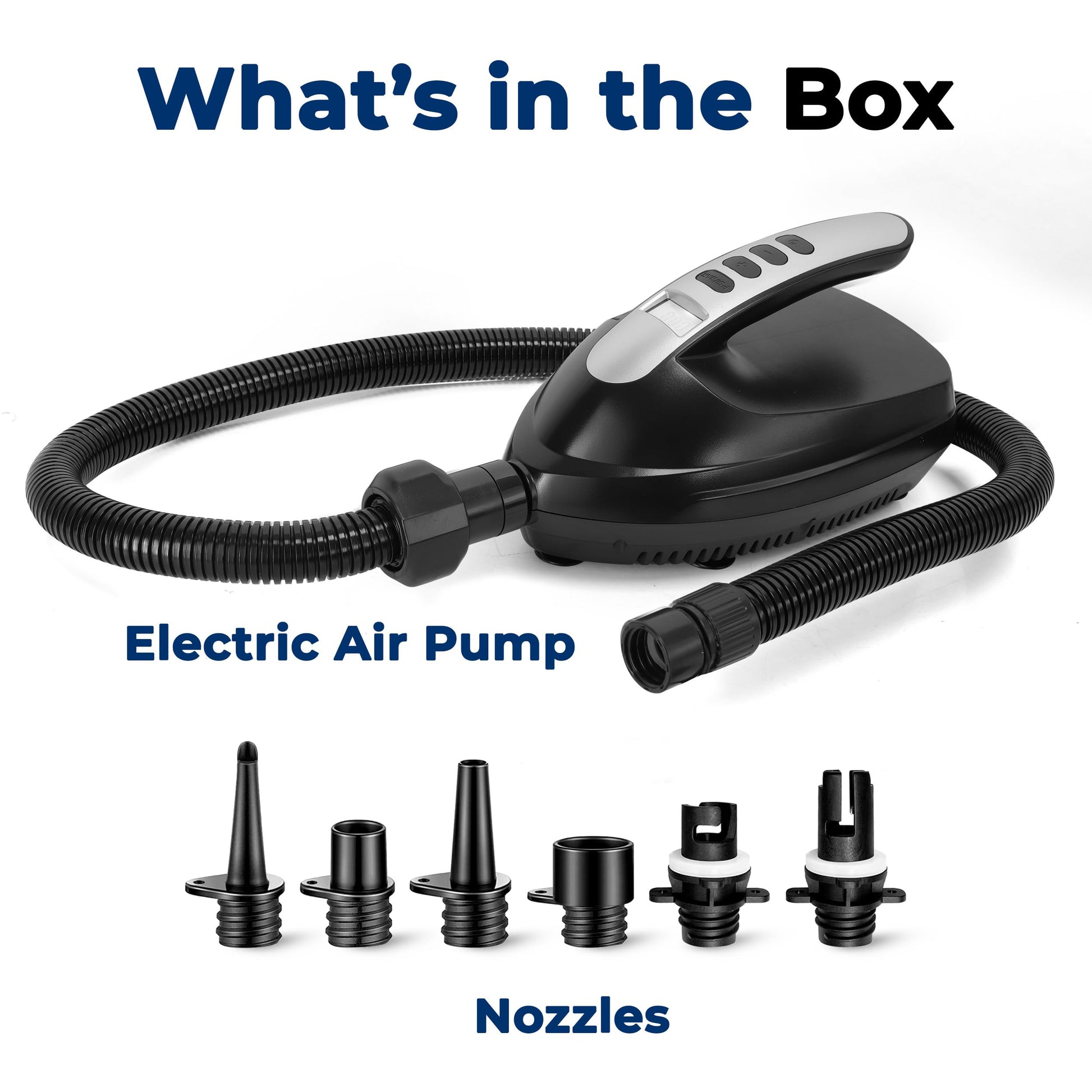 • VERSATILE FOR ALL INFLATABLES – The electric pump for inflatables comes equipped with 6 universal nozzles to fit a wide variety of gear including paddle boards, kayaks, boats, pool floats, air mattresses, and more.